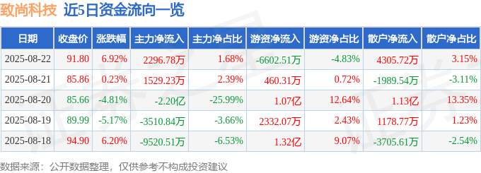 证券之星消息,截至2025年8月22日收盘,致尚科技(301486)报收于91.8元,上涨6.92%,换手率20.58%,成交量14.91万手,成交额13.67亿元。