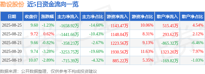 证券之星消息,截至2025年8月25日收盘,勘设股份(603458)报收于9.6元,下跌1.23%,换手率3.84%,成交量11.75万手,成交额1.14亿元。