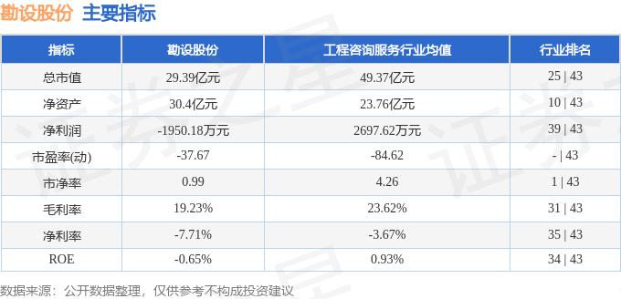 勘设股份2025年一季报显示,公司主营收入2.57亿元,同比下降2.12%;归母净利润-1950.18万元,同比上升33.06%;扣非净利润-2022.12万元,同比上升34.25%;负债率47.62%,投资收益274.75万元,财务费用938.43万元,毛利率19.23%。勘设股份(603458)主营业务:工程咨询与工程承包业务,覆盖公路、市政、建筑、水运、环保等行业,主要提供公路、桥梁、隧道、岩土、机电、市政、建筑、港口与航道等领域的勘察、设计、咨询、检验检测、监理、施工、总承包等工程技术服务。核心业务是公路行业工程咨询与工程承包业务。