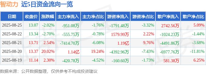 证券之星消息,截至2025年8月25日收盘,智动力(300686)报收于13.07元,下跌2.02%,换手率21.45%,成交量41.55万手,成交额5.39亿元。