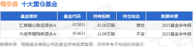 根据2025基金半年报公募基金重仓股数据,重仓该股的公募基金共2家,其中持有数量最多的公募基金为汇泉基金的汇泉臻心致远混合A。汇泉臻心致远混合A目前规模为0.84亿元,最新净值0.5028(8月22日),较上一交易日上涨2.4%,近一年上涨15.4%。该公募基金现任基金经理为梁永强 刘源。梁永强在任的基金产品包括:汇泉策略优选混合A,管理时间为2021年7月20日至今,期间收益率为-42.88%;汇泉兴至未来一年持有混合A,管理时间为2022年4月6日至今,期间收益率为-14.83%。刘源在任的基金产品包括:汇泉兴至未来一年持有混合A,管理时间为2025年6月10日至今,期间收益率为28.97%;