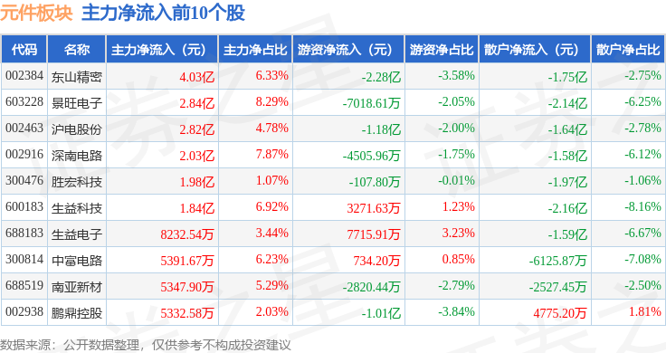从资金流向上来看,当日元件板块主力资金净流入1.62亿元,游资资金净流入7345.43万元,散户资金净流出2.36亿元。元件板块个股资金流向见下表: