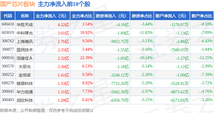 从资金流向上来看,当日国产芯片板块主力资金净流出220.47亿元,游资资金净流入76.66亿元,散户资金净流入143.81亿元。国产芯片板块个股资金流向见下表: