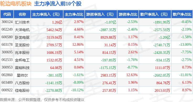 从资金流向上来看,当日轮边电机板块主力资金净流出1.44亿元,游资资金净流入5188.68万元,散户资金净流入9202.55万元。轮边电机板块个股资金流向见下表:
