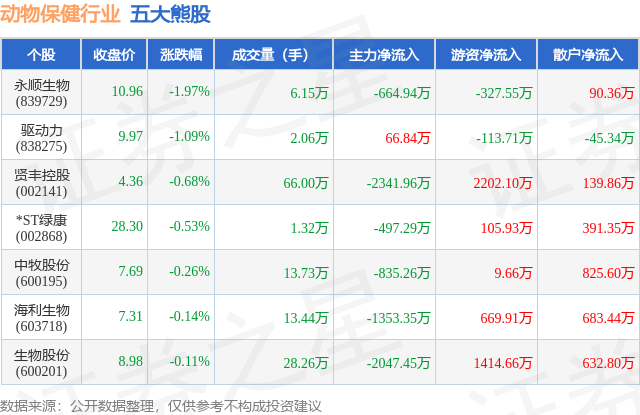 个股表现方面,动物保健行业当日领跌股为永顺生物(839729),该股当日报收10.96,下跌1.97%,成交量6.15万,主力资金净流出664.94万元。驱动力(838275)以下跌1.09%紧随其后,该股当日成交量2.06万,主力资金净流入66.84万元。除此之外,贤丰控股(002141)、*ST绿康(002868)、中牧股份(600195)均进入当日熊股之列。具体个股列表见下表: