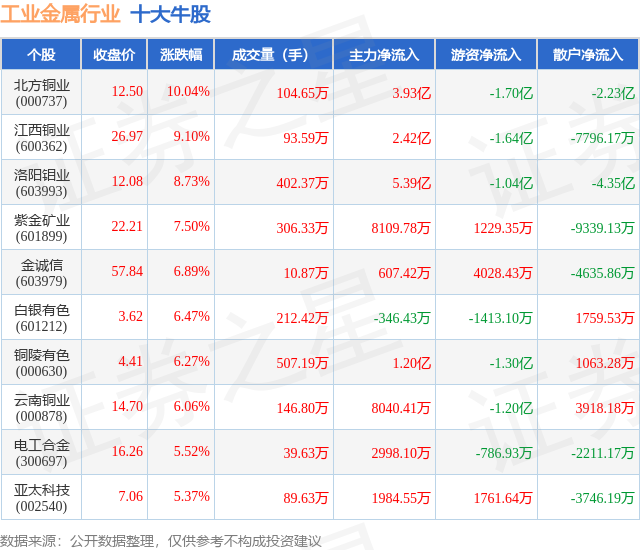 个股表现方面,工业金属行业当日领涨股为北方铜业(000737),该股当日报收12.5,上涨10.04%,成交量104.65万,主力资金净流入3.93亿元。江西铜业(600362)以上涨9.1%紧随其后,该股当日成交量93.59万,主力资金净流入2.42亿元。除此之外,洛阳钼业(603993)、紫金矿业(601899)、金诚信(603979)均进入当日牛股之列。具体个股列表见下表: