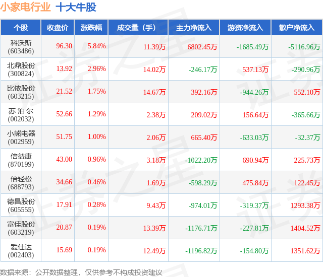 个股表现方面,小家电行业当日领涨股为科沃斯(603486),该股当日报收96.3,上涨5.84%,成交量11.39万,主力资金净流入6802.45万元。北鼎股份(300824)以上涨2.96%紧随其后,该股当日成交量14.02万,主力资金净流出246.17万元。除此之外,比依股份(603215)、苏 泊 尔(002032)、小熊电器(002959)均进入当日牛股之列。具体个股列表见下表: