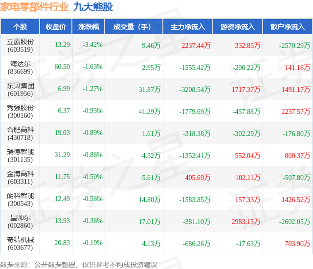 个股表现方面,家电零部件行业当日领跌股为立霸股份(603519),该股当日报收13.29,下跌3.42%,成交量9.46万,主力资金净流入2237.44万元。海达尔(836699)以下跌1.63%紧随其后,该股当日成交量2.95万,主力资金净流出1555.42万元。除此之外,东贝集团(601956)、秀强股份(300160)、合肥高科(430718)均进入当日熊股之列。具体个股列表见下表: