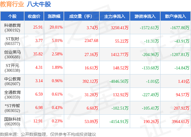 个股表现方面,教育行业当日领涨股为科德教育(300192),该股当日报收25.91,上涨20.01%,成交量3.74万,主力资金净流入3250.41万元。ST东时(603377)以上涨5.01%紧随其后,该股当日成交量2348.0,主力资金净流入55.22万元。除此之外,创业黑马(300688)、ST开元(300338)、中公教育(002607)均进入当日牛股之列。具体个股列表见下表: