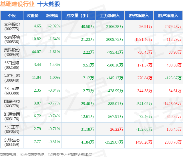 个股表现方面,基础建设行业当日领跌股为文科股份(002775),该股当日报收4.65,下跌2.92%,成交量40.5万,主力资金净流出2106.38万元。农尚环境(300536)以下跌1.64%紧随其后,该股当日成交量21.23万,主力资金净流出2009.75万元。除此之外,奥雅股份(300949)、*ST围海(002586)、冠中生态(300948)均进入当日熊股之列。具体个股列表见下表: