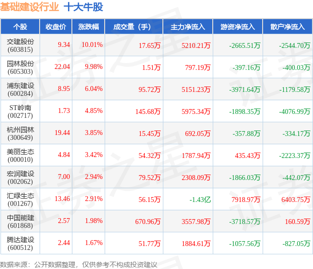 个股表现方面,基础建设行业当日领涨股为交建股份(603815),该股当日报收9.34,上涨10.01%,成交量17.65万,主力资金净流入5210.21万元。园林股份(605303)以上涨9.98%紧随其后,该股当日成交量1.51万,主力资金净流入797.19万元。除此之外,浦东建设(600284)、ST岭南(002717)、杭州园林(300649)均进入当日牛股之列。具体个股列表见下表: