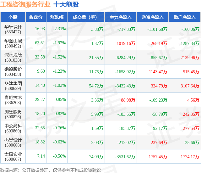 个股表现方面,工程咨询服务行业当日领跌股为华维设计(833427),该股当日报收16.93,下跌2.31%,成交量3.88万,主力资金净流出717.33万元。华图山鼎(300492)以下跌1.97%紧随其后,该股当日成交量1.87万,主力资金净流入1019.16万元。除此之外,深水规院(301038)、勘设股份(603458)、华建集团(600629)均进入当日熊股之列。具体个股列表见下表: