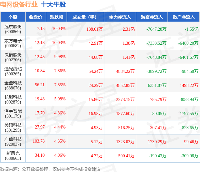 个股表现方面,电网设备行业当日领涨股为远东股份(600869),该股当日报收7.13,上涨10.03%,成交量188.61万,主力资金净流入2.31亿元。东方电子(000682)以上涨10.03%紧随其后,该股当日成交量42.91万,主力资金净流入1.38亿元。除此之外,良信股份(002706)、通光线缆(300265)、金盘科技(688676)均进入当日牛股之列。具体个股列表见下表: