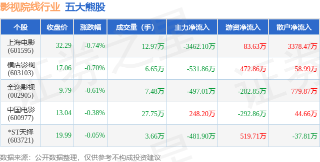 个股表现方面,影视院线行业当日领跌股为上海电影(601595),该股当日报收32.29,下跌0.74%,成交量12.97万,主力资金净流出3462.1万元。横店影视(603103)以下跌0.7%紧随其后,该股当日成交量6.65万,主力资金净流出531.86万元。除此之外,金逸影视(002905)、中国电影(600977)、*ST天择(603721)均进入当日熊股之列。具体个股列表见下表: