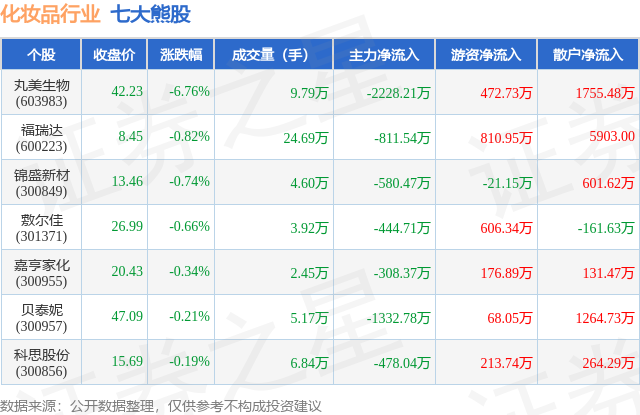 个股表现方面,化妆品行业当日领跌股为丸美生物(603983),该股当日报收42.23,下跌6.76%,成交量9.79万,主力资金净流出2228.21万元。福瑞达(600223)以下跌0.82%紧随其后,该股当日成交量24.69万,主力资金净流出811.54万元。除此之外,锦盛新材(300849)、敷尔佳(301371)、嘉亨家化(300955)均进入当日熊股之列。具体个股列表见下表: