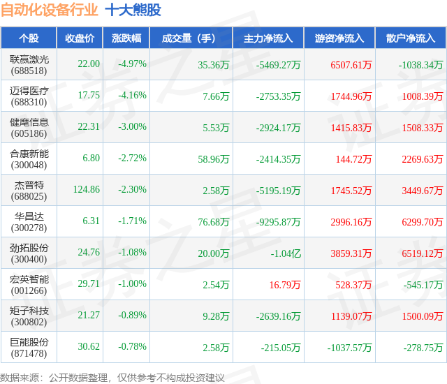 个股表现方面,自动化设备行业当日领跌股为联赢激光(688518),该股当日报收22.0,下跌4.97%,成交量35.36万,主力资金净流出5469.27万元。迈得医疗(688310)以下跌4.16%紧随其后,该股当日成交量7.66万,主力资金净流出2753.35万元。除此之外,健麾信息(605186)、合康新能(300048)、杰普特(688025)均进入当日熊股之列。具体个股列表见下表: