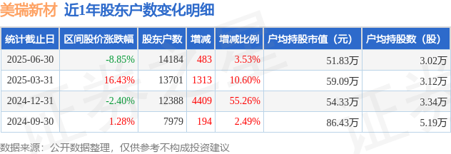 从股价来看,2025年3月31日至2025年6月30日,美瑞新材区间跌幅为8.85%,在此期间股东户数增加483.0户,增幅为3.53%。