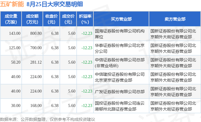证券之星消息,8月25日五矿新能发生大宗交易,交易数据如下: