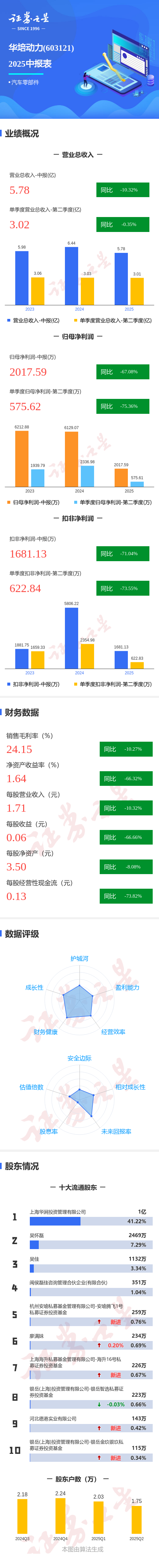 证券之星消息,华培动力2025年中报显示,公司主营收入5.78亿元,同比下降10.32%;归母净利润2017.59万元,同比下降67.08%;扣非净利润1681.13万元,同比下降71.05%;其中2025年第二季度,公司单季度主营收入3.02亿元,同比下降0.35%;单季度归母净利润575.62万元,同比下降75.37%;单季度扣非净利润622.84万元,同比下降73.55%;负债率44.19%,投资收益-35.84万元,财务费用440.89万元,毛利率24.15%。