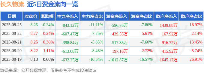 证券之星消息,截至2025年8月25日收盘,长久物流(603569)报收于8.25元,下跌0.24%,换手率1.52%,成交量9.2万手,成交额7590.5万元。