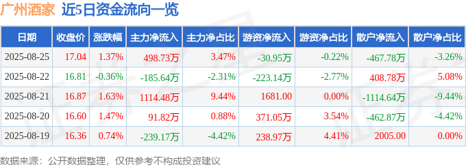 证券之星消息,截至2025年8月25日收盘,广州酒家(603043)报收于17.04元,上涨1.37%,换手率1.5%,成交量8.51万手,成交额1.44亿元。