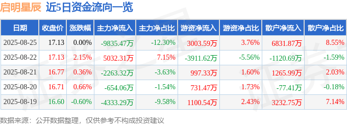 8月25日的资金流向数据方面,主力资金净流出9835.47万元,占总成交额12.3%,游资资金净流入3003.59万元,占总成交额3.76%,散户资金净流入6831.87万元,占总成交额8.55%。