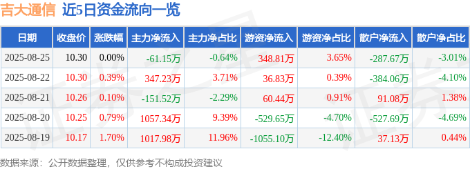 8月25日的资金流向数据方面,主力资金净流出61.15万元,占总成交额0.64%,游资资金净流入348.81万元,占总成交额3.65%,散户资金净流出287.67万元,占总成交额3.01%。