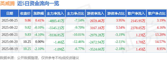 8月25日的资金流向数据方面,主力资金净流出4805.41万元,占总成交额7.14%,游资资金净流入2659.46万元,占总成交额3.95%,散户资金净流入2145.95万元,占总成交额3.19%。