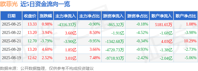 证券之星消息,截至2025年8月25日收盘,欧菲光(002456)报收于13.33元,上涨0.98%,换手率10.8%,成交量357.83万手,成交额47.76亿元。