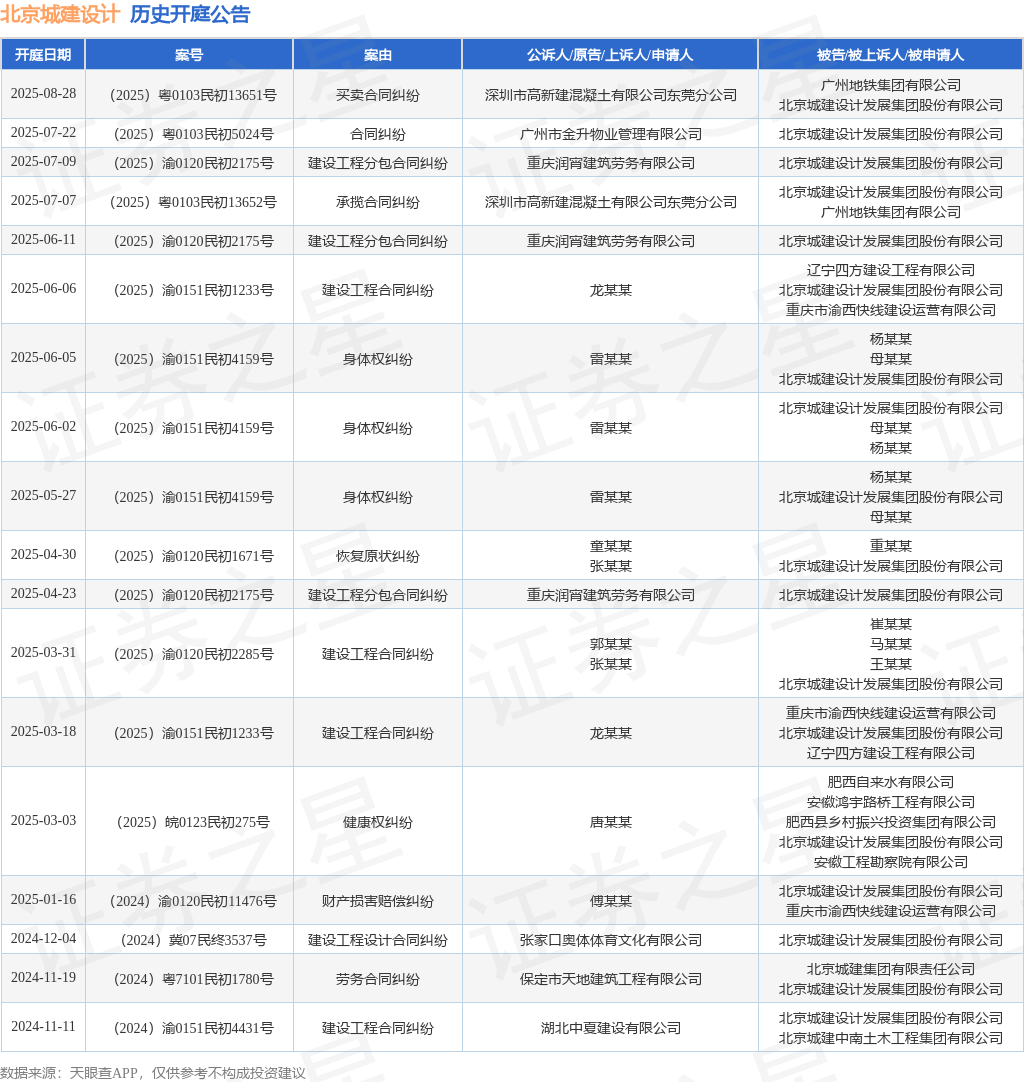 案号:(2025)粤0103民初13651号根据统计,近一年内以北京城建设计发展集团股份有限公司为当事人的历史开庭公告有18则,其中案由为“建设工程合同纠纷”的公告以4则居首,其次为“建设工程分包合同纠纷”有3则,“身体权纠纷”有3则。历史开庭公告如下: