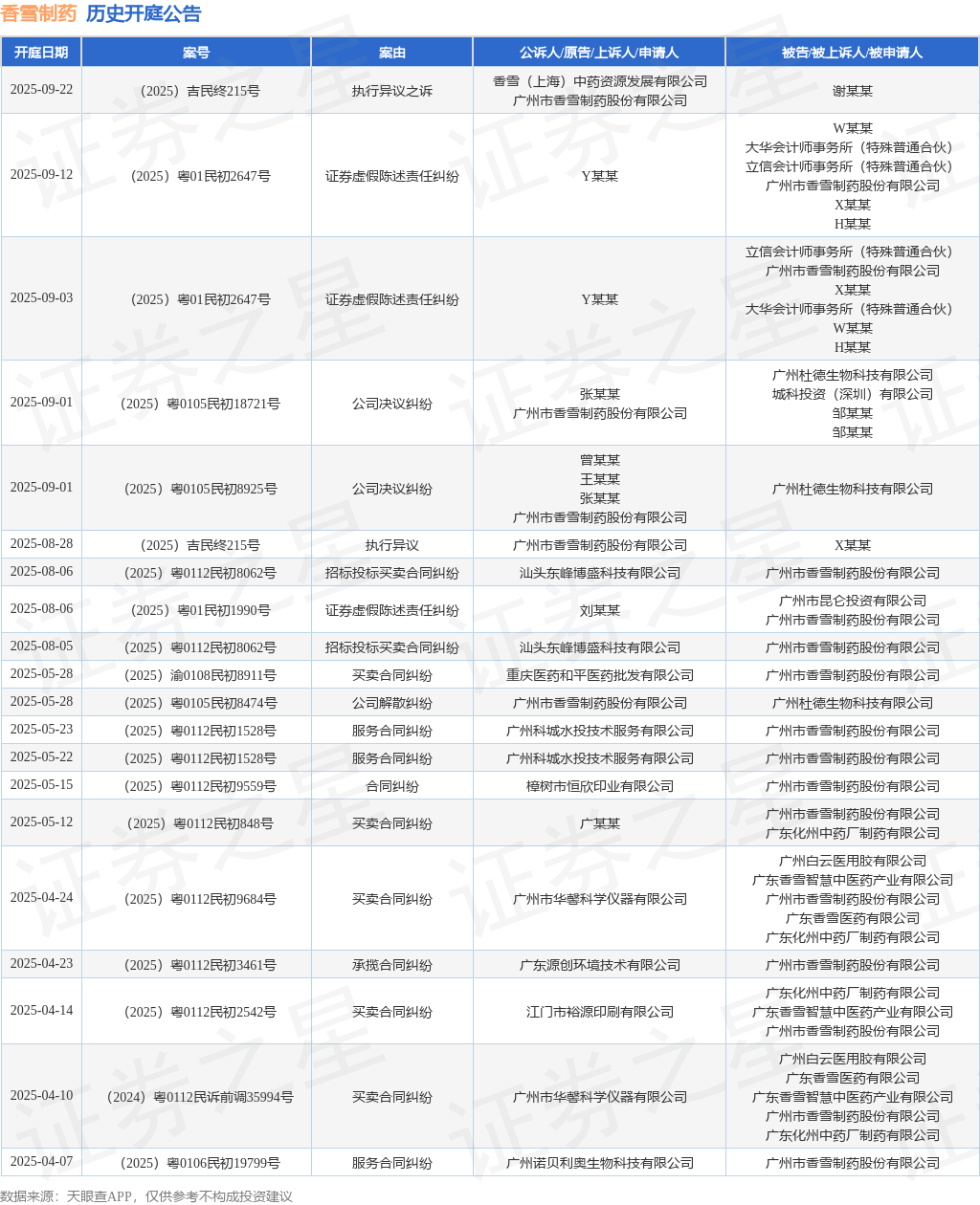 案号:(2025)吉民终215号根据统计,近一年内以广州市香雪制药股份有限公司为当事人的历史开庭公告有57则,其中案由为“买卖合同纠纷”的公告以21则居首,其次为“服务合同纠纷”有6则,“建设工程施工合同纠纷”有6则。历史开庭公告(前20条)如下: