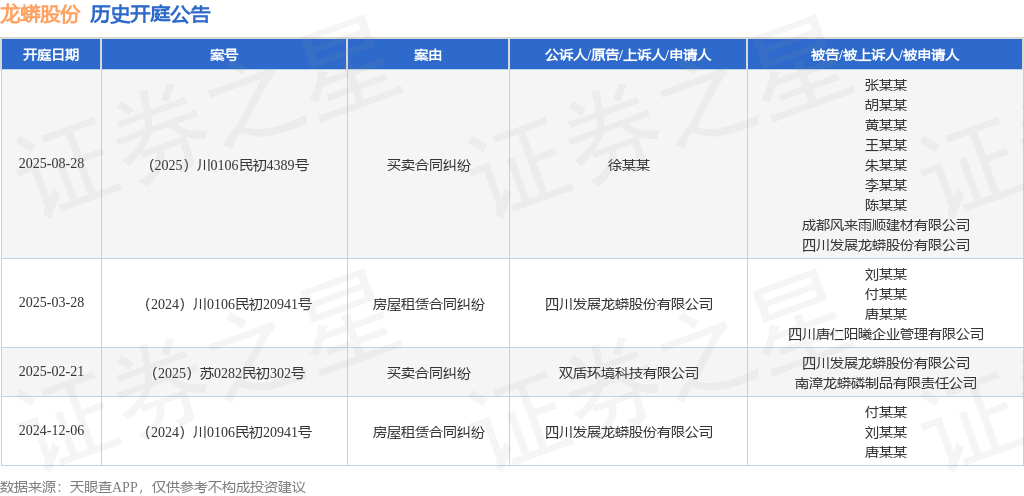 根据统计,近一年内以四川发展龙蟒股份有限公司为当事人的历史开庭公告有4则,其中案由为“买卖合同纠纷”的公告以2则居首,其次为“房屋租赁合同纠纷”有2则。历史开庭公告如下:
