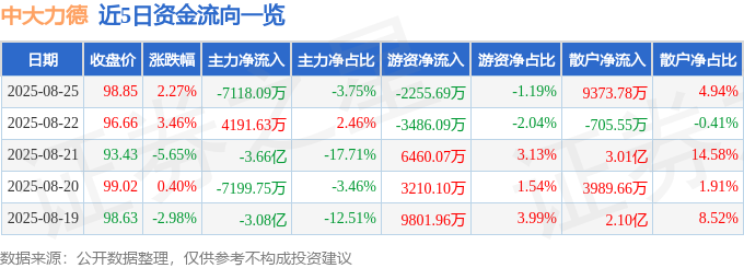 证券之星消息,截至2025年8月25日收盘,中大力德(002896)报收于98.85元,上涨2.27%,换手率9.74%,成交量19.13万手,成交额18.96亿元。