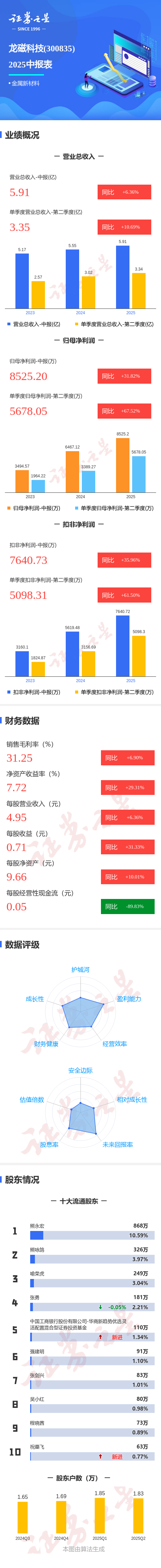 证券之星消息,龙磁科技2025年中报显示,公司主营收入5.91亿元,同比上升6.36%;归母净利润8525.2万元,同比上升31.82%;扣非净利润7640.73万元,同比上升35.97%;其中2025年第二季度,公司单季度主营收入3.35亿元,同比上升10.69%;单季度归母净利润5678.05万元,同比上升67.53%;单季度扣非净利润5098.31万元,同比上升61.51%;负债率49.9%,投资收益521.64万元,财务费用636.97万元,毛利率31.25%。