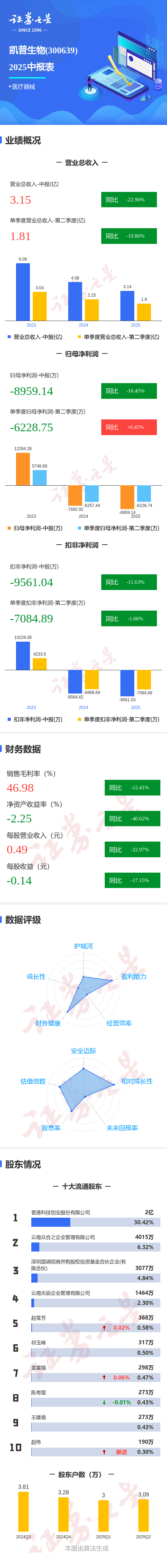 证券之星消息,凯普生物2025年中报显示,公司主营收入3.15亿元,同比下降22.96%;归母净利润-8959.14万元,同比下降16.46%;扣非净利润-9561.04万元,同比下降11.63%;其中2025年第二季度,公司单季度主营收入1.81亿元,同比下降19.87%;单季度归母净利润-6228.75万元,同比上升0.46%;单季度扣非净利润-7084.89万元,同比下降1.67%;负债率13.28%,投资收益24.34万元,财务费用-2182.01万元,毛利率46.98%。