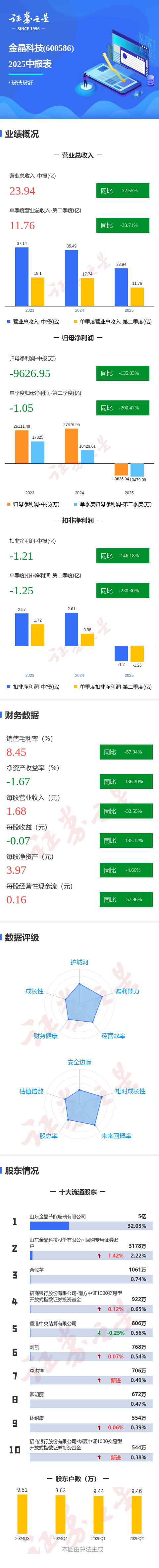 证券之星消息,金晶科技2025年中报显示,公司主营收入23.94亿元,同比下降32.56%;归母净利润-9626.95万元,同比下降135.04%;扣非净利润-1.21亿元,同比下降146.18%;其中2025年第二季度,公司单季度主营收入11.76亿元,同比下降33.71%;单季度归母净利润-1.05亿元,同比下降200.47%;单季度扣非净利润-1.25亿元,同比下降230.31%;负债率43.91%,投资收益-1118.11万元,财务费用3554.08万元,毛利率8.45%。