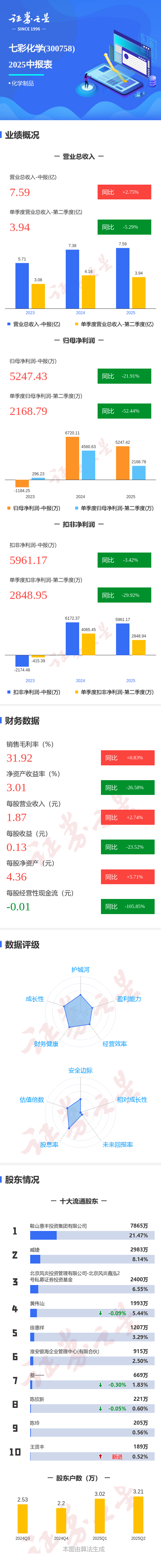 证券之星消息,七彩化学2025年中报显示,公司主营收入7.59亿元,同比上升2.75%;归母净利润5247.43万元,同比下降21.91%;扣非净利润5961.17万元,同比下降3.42%;其中2025年第二季度,公司单季度主营收入3.94亿元,同比下降5.3%;单季度归母净利润2168.79万元,同比下降52.45%;单季度扣非净利润2848.95万元,同比下降29.92%;负债率49.91%,投资收益329.01万元,财务费用1841.87万元,毛利率31.92%。
