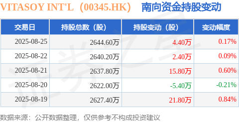 证券之星消息,8月25日南向资金增持4.4万股VITASOY INT'L(00345.HK)。近5个交易日中,获南向资金增持的有4天,累计净增持39.0万股。近20个交易日中,获南向资金增持的有12天,累计净增持164.4万股。截至目前,南向资金持有VITASOY INT'L(00345.HK)2644.6万股,占公司已发行普通股的2.49%。