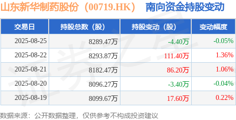 证券之星消息,8月25日南向资金减持4.4万股山东新华制药股份(00719.HK)。近5个交易日中,获南向资金增持的有3天,累计净增持207.4万股。近20个交易日中,获南向资金减持的有12天,累计净减持1034.4万股。截至目前,南向资金持有山东新华制药股份(00719.HK)8289.47万股,占公司已发行普通股的42.5%。