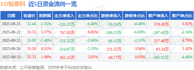 证券之星消息,截至2025年8月25日收盘,XD钜泉科(688391)报收于32.44元,下跌1.55%,换手率4.38%,成交量2.51万手,成交额8243.84万元。