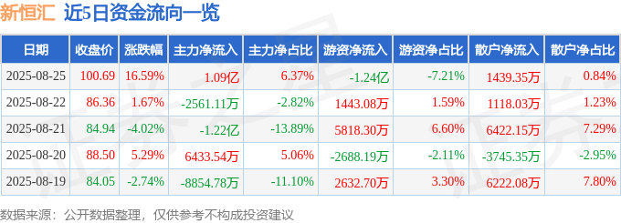 证券之星消息,截至2025年8月25日收盘,新恒汇(301678)报收于100.69元,上涨16.59%,换手率39.4%,成交量17.93万手,成交额17.13亿元。