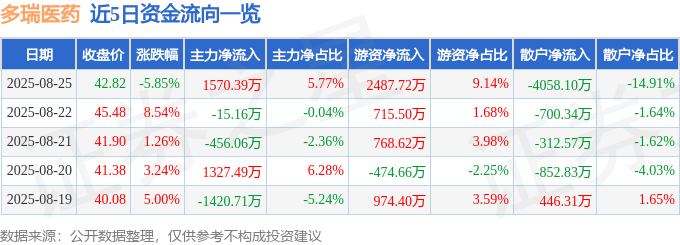证券之星消息,截至2025年8月25日收盘,多瑞医药(301075)报收于42.82元,下跌5.85%,换手率7.87%,成交量6.3万手,成交额2.72亿元。