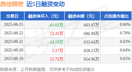 证券之星消息,8月25日,鼎佳精密(920005)融资买入49.67万元,融资偿还132.7万元,融资净卖出83.03万元,融资余额603.97万元,近20个交易日中有12个交易日出现融资净买入。