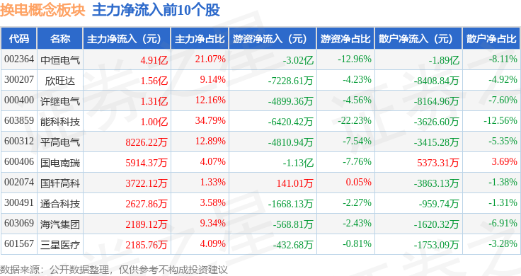 从资金流向上来看,当日换电概念板块主力资金净流出8.74亿元,游资资金净流出4155.67万元,散户资金净流入9.16亿元。换电概念板块个股资金流向见下表: