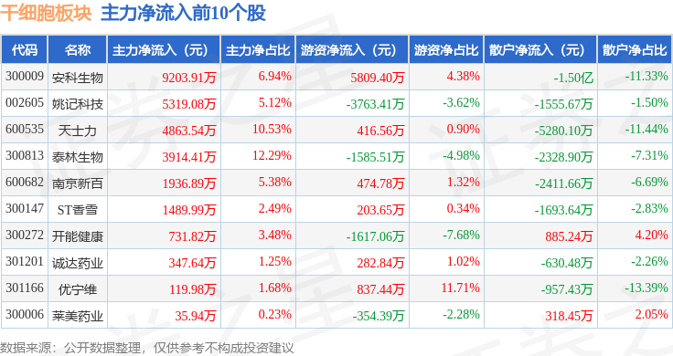 从资金流向上来看,当日干细胞板块主力资金净流出6.81亿元,游资资金净流入2.72亿元,散户资金净流入4.09亿元。干细胞板块个股资金流向见下表: