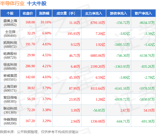个股表现方面,半导体行业当日领涨股为盛美上海(688082),该股当日报收168.0,上涨10.16%,成交量11.16万,主力资金净流入8791.1万元。士兰微(600460)以上涨6.6%紧随其后,该股当日成交量195.93万,主力资金净流入7.2亿元。除此之外,拓荆科技(688072)、屹唐股份(688729)、恒玄科技(688608)均进入当日牛股之列。具体个股列表见下表: