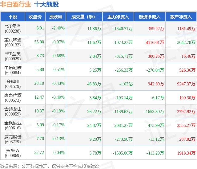 个股表现方面,非白酒行业当日领跌股为*ST椰岛(600238),该股当日报收6.91,下跌2.4%,成交量11.86万,主力资金净流出1540.71万元。重庆啤酒(600132)以下跌0.97%紧随其后,该股当日成交量11.62万,主力资金净流出1073.23万元。除此之外,*ST兰黄(000929)、中信尼雅(600084)、会稽山(601579)均进入当日熊股之列。具体个股列表见下表: