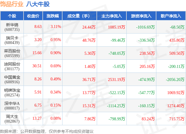 个股表现方面,饰品行业当日领涨股为新华锦(600735),该股当日报收8.63,上涨3.11%,成交量24.44万,主力资金净流入1085.19万元。瑞贝卡(600439)以上涨0.95%紧随其后,该股当日成交量48.76万,主力资金净流出99.46万元。除此之外,菜百股份(605599)、迪阿股份(301177)、中国黄金(600916)均进入当日牛股之列。具体个股列表见下表: