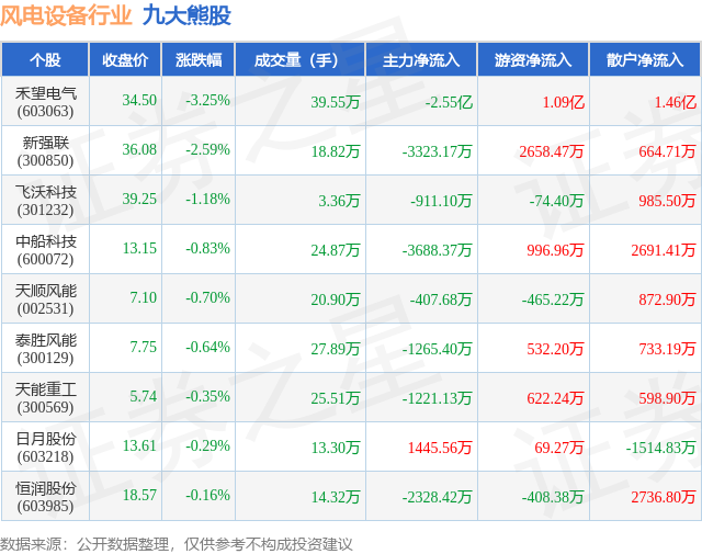 个股表现方面,风电设备行业当日领跌股为禾望电气(603063),该股当日报收34.5,下跌3.25%,成交量39.55万,主力资金净流出2.55亿元。新强联(300850)以下跌2.59%紧随其后,该股当日成交量18.82万,主力资金净流出3323.17万元。除此之外,飞沃科技(301232)、中船科技(600072)、天顺风能(002531)均进入当日熊股之列。具体个股列表见下表: