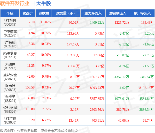 个股表现方面,软件开发行业当日领涨股为*ST东通(300379),该股当日报收7.1,上涨11.46%,成交量80.02万,主力资金净流出1409.22万元。中电鑫龙(002298)以上涨10.05%紧随其后,该股当日成交量113.95万,主力资金净流入5.73亿元。除此之外,广联达(002410)、拓维信息(002261)、天融信(002212)均进入当日牛股之列。具体个股列表见下表: